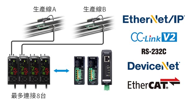 為了同時收集並輸出目標物的靜電量及周圍的溫濕度資料,感測器標準配備獨立的三通道判斷輸出,以及類比電壓與電流輸出功能。此外,透過搭配通訊模組,可整合傳送主模組與擴充模組所連接的最多八臺設(shè)備的資料。亦可由PC或PLC端讀取資料與修改設(shè)定值,進一步大幅縮短工時、提升作業(yè)效率。